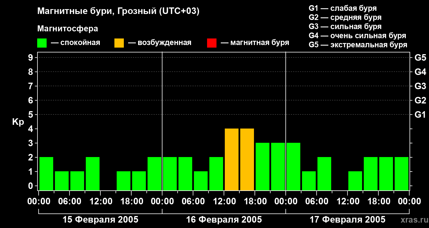 Изменения геомагнитного индекса Kp с 15 по 17 февраля 2005 года для средних широт