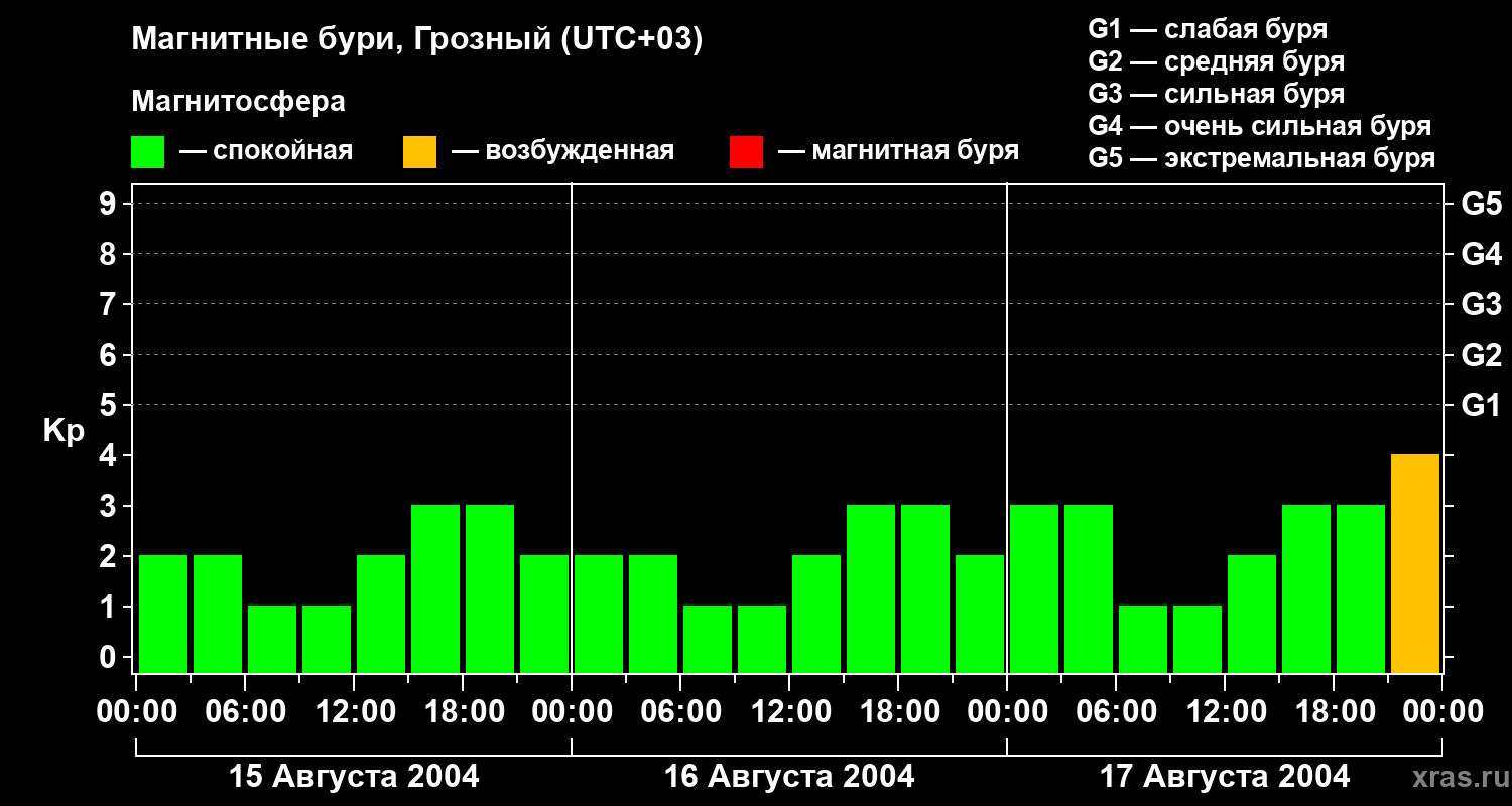 Изменения геомагнитного индекса Kp с 15 по 17 августа 2004 года для средних широт