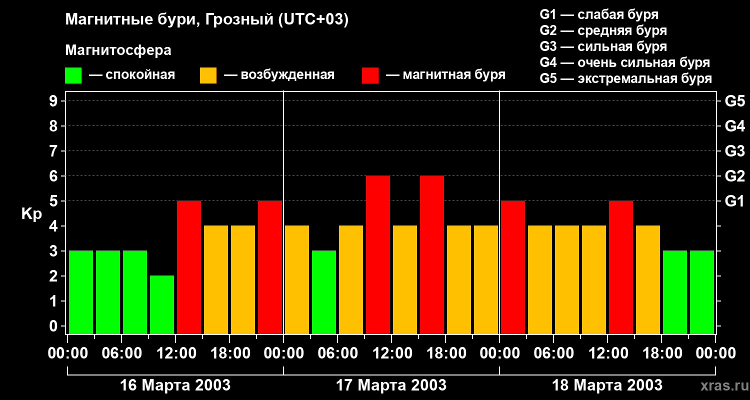 Изменения геомагнитного индекса Kp с 16 по 18 марта 2003 года для средних широт