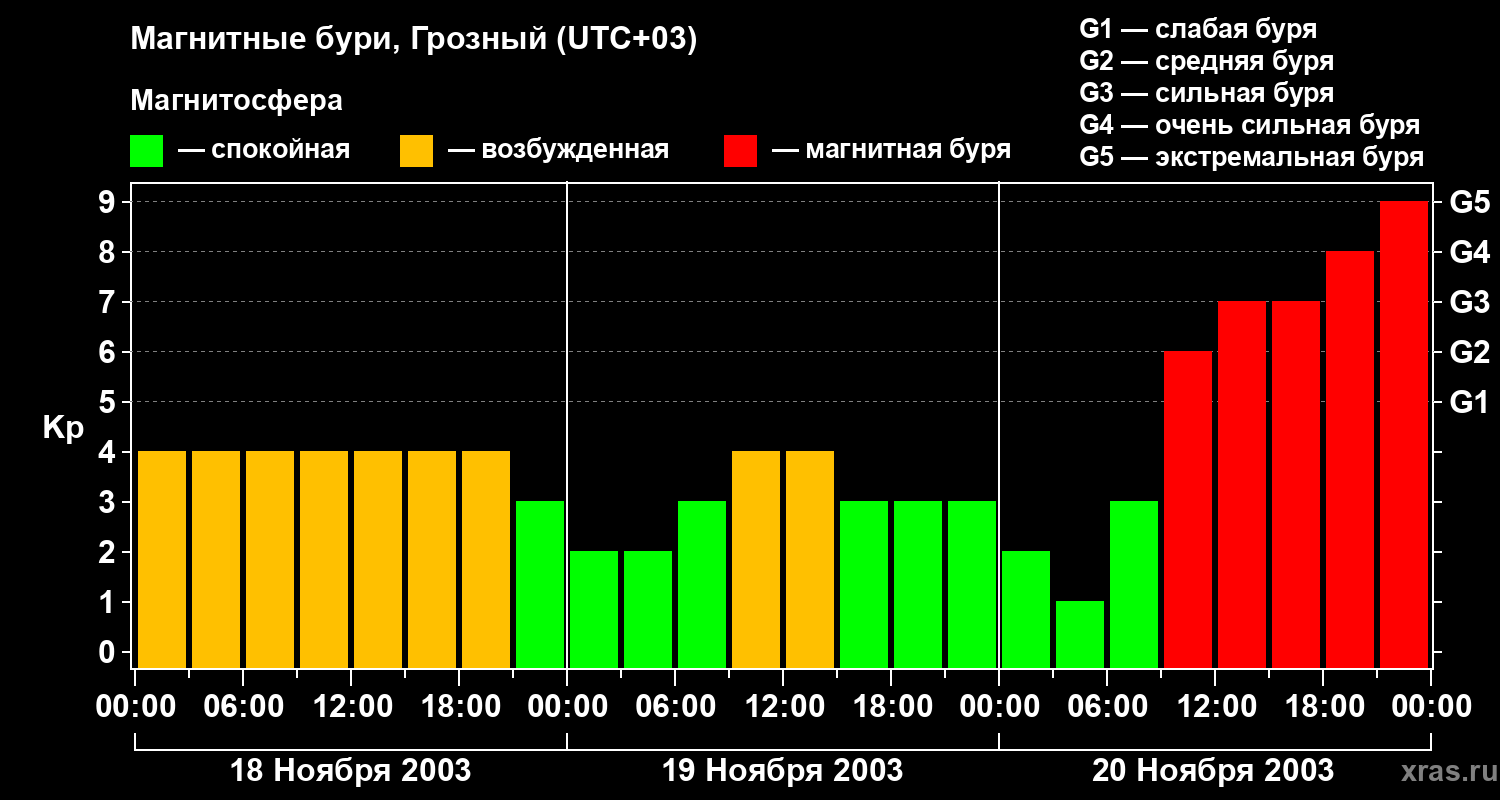 Изменения геомагнитного индекса Kp с 18 по 20 ноября 2003 года для средних широт