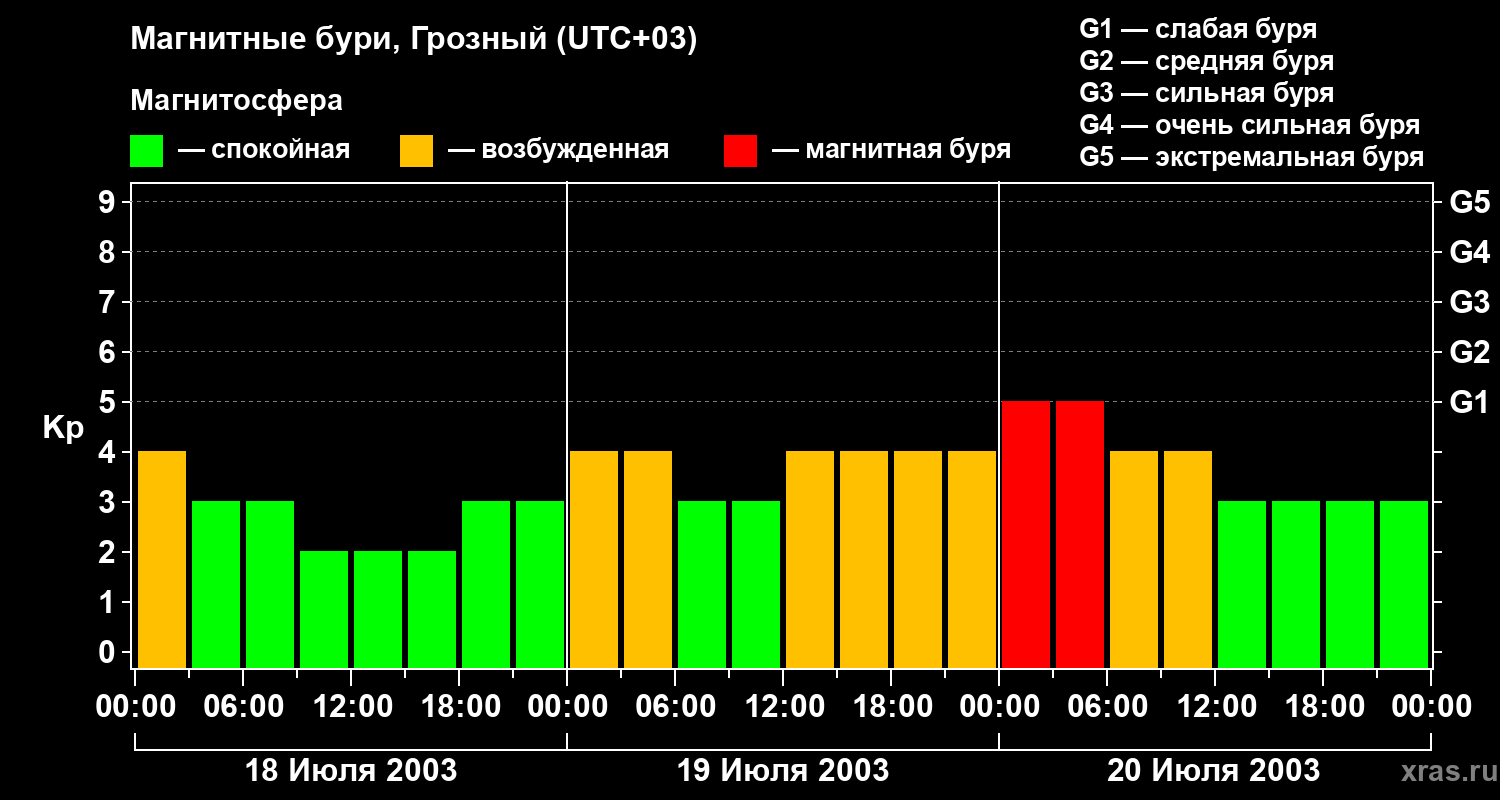 Изменения геомагнитного индекса Kp с 18 по 20 июля 2003 года для средних широт