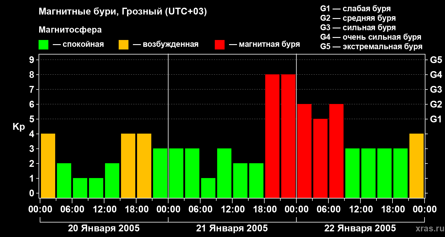 Изменения геомагнитного индекса Kp с 20 по 22 января 2005 года для средних широт