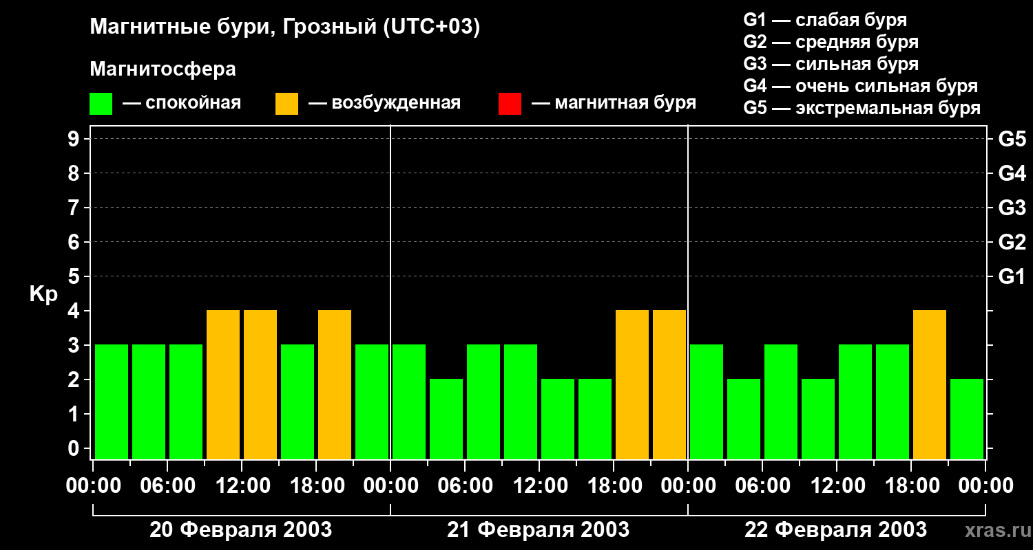 Изменения геомагнитного индекса Kp с 20 по 22 февраля 2003 года для средних широт