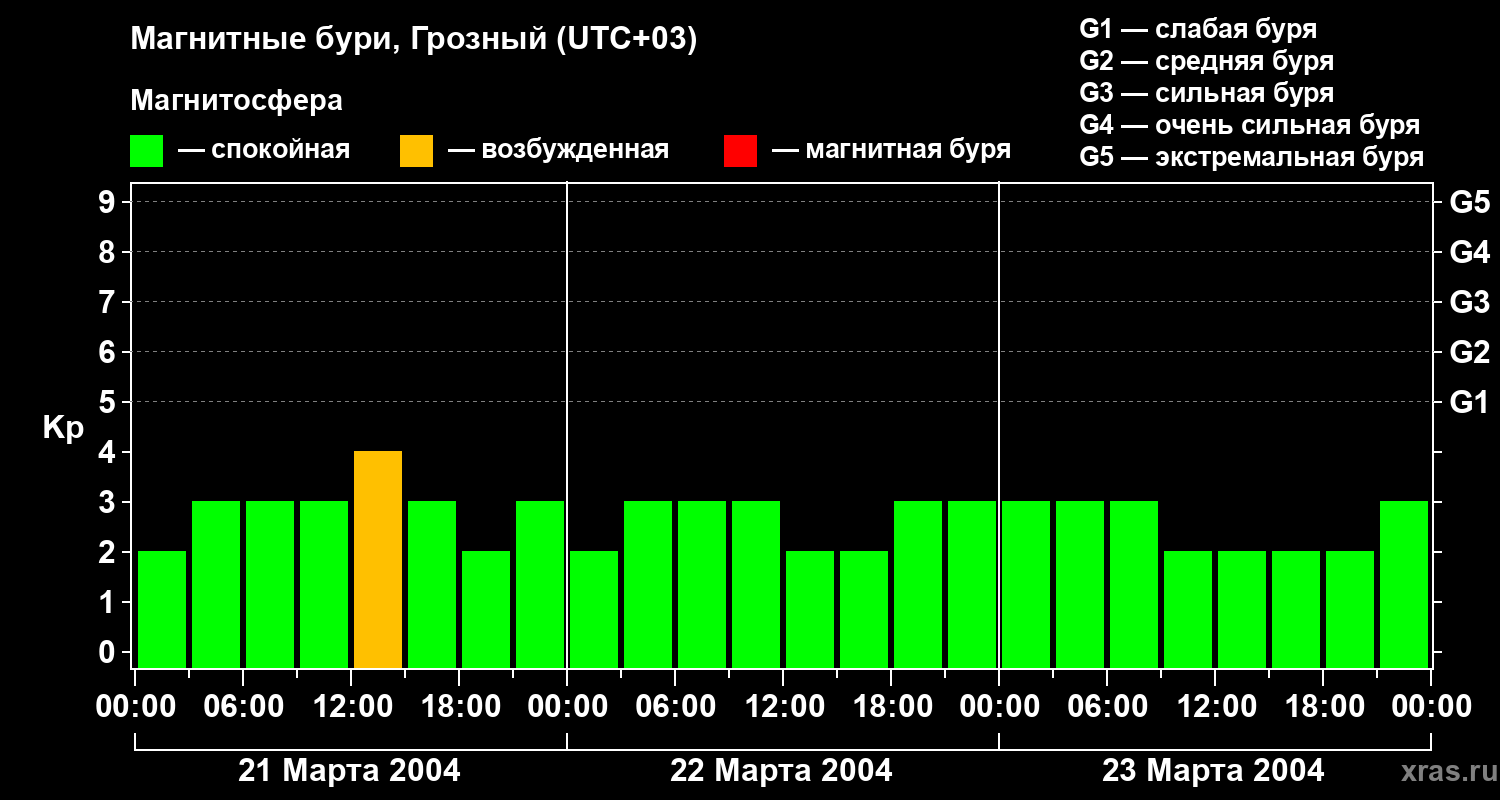 Изменения геомагнитного индекса Kp с 21 по 23 марта 2004 года для средних широт