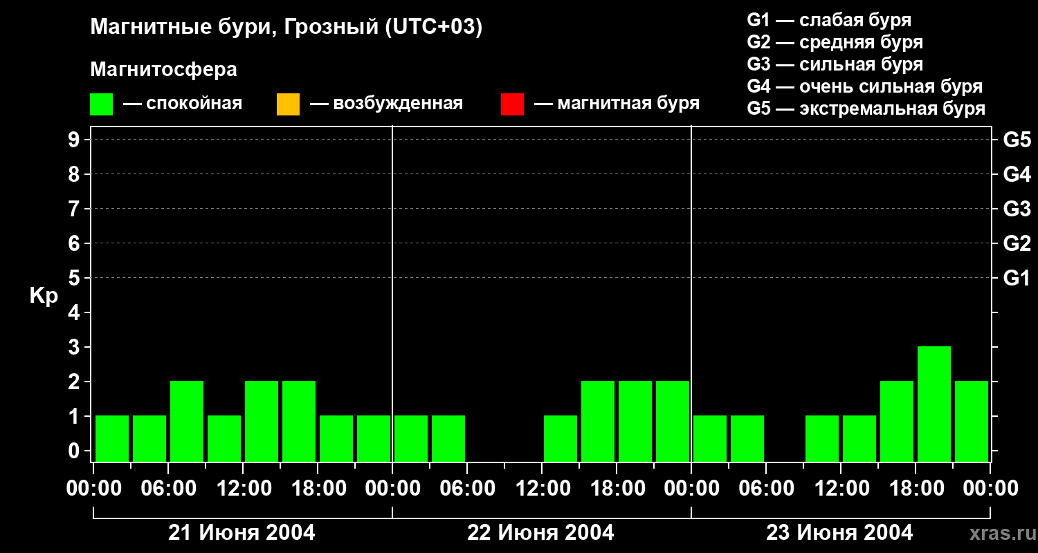 Изменения геомагнитного индекса Kp с 21 по 23 июня 2004 года для средних широт