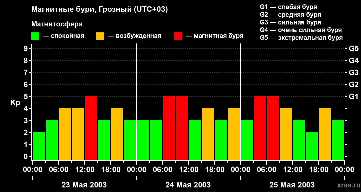 Изменения геомагнитного индекса Kp с 23 по 25 мая 2003 года для средних широт