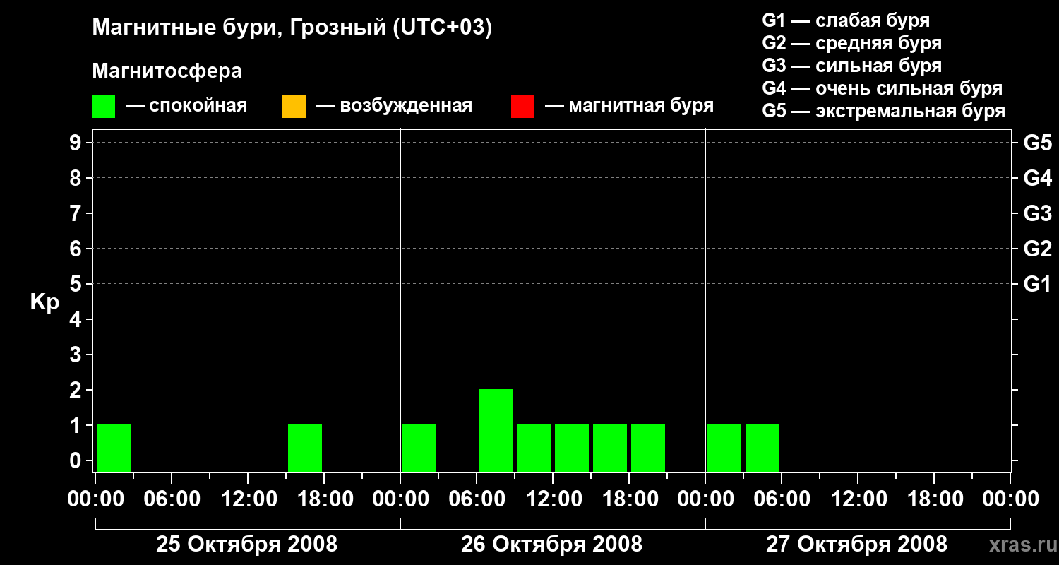 Изменения геомагнитного индекса Kp с 25 по 27 октября 2008 года для средних широт