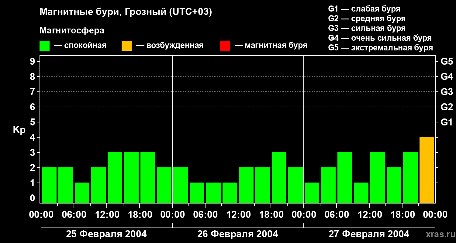 Изменения геомагнитного индекса Kp с 25 по 27 февраля 2004 года для средних широт