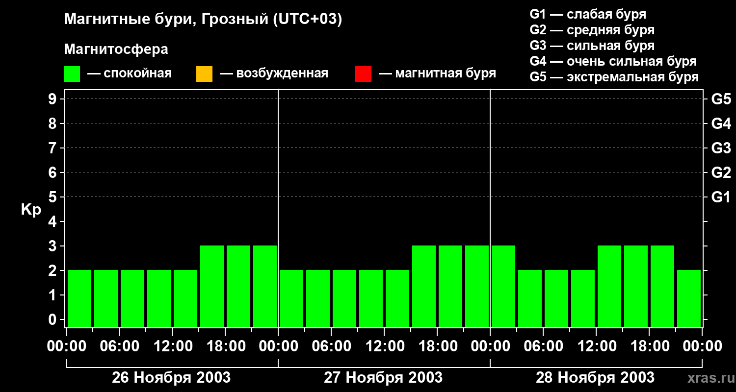 Изменения геомагнитного индекса Kp с 26 по 28 ноября 2003 года для средних широт