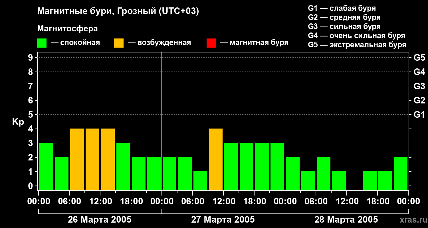 Изменения геомагнитного индекса Kp с 26 по 28 марта 2005 года для средних широт