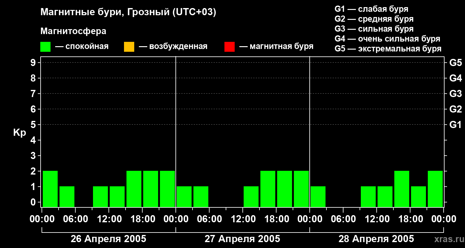 Изменения геомагнитного индекса Kp с 26 по 28 апреля 2005 года для средних широт