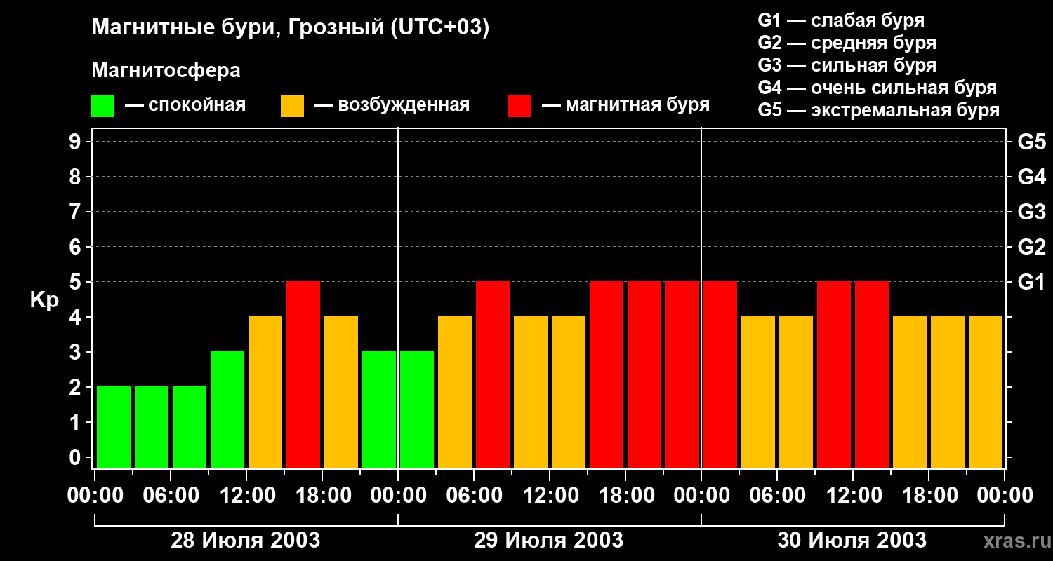 Изменения геомагнитного индекса Kp с 28 по 30 июля 2003 года для средних широт