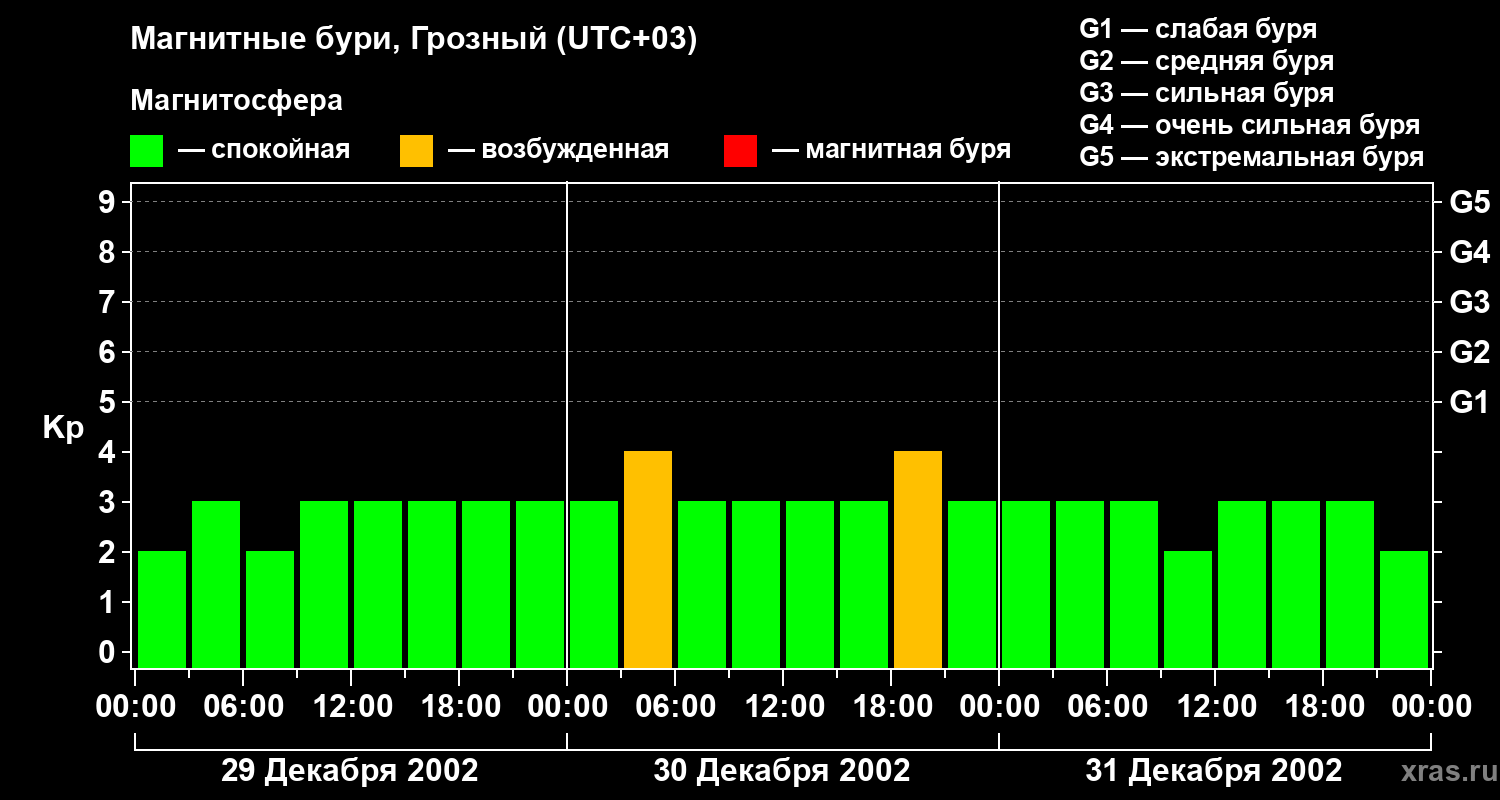 Изменения геомагнитного индекса Kp с 29 по 31 декабря 2002 года для средних широт