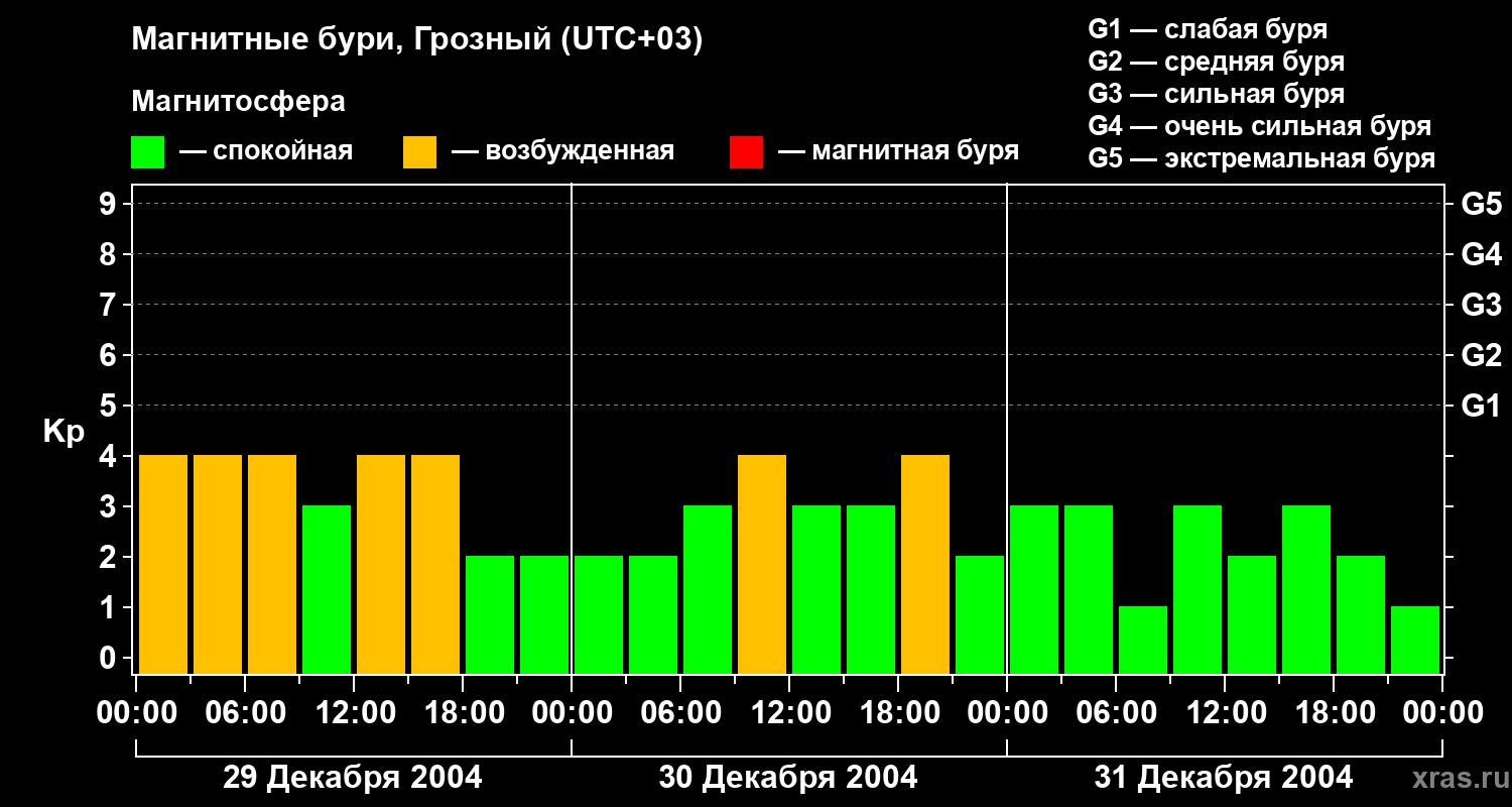 Изменения геомагнитного индекса Kp с 29 по 31 декабря 2004 года для средних широт