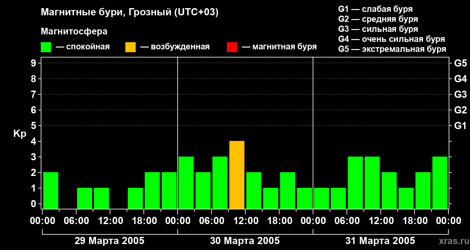 Изменения геомагнитного индекса Kp с 29 по 31 марта 2005 года для средних широт
