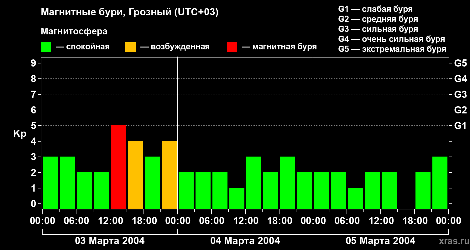 Изменения геомагнитного индекса Kp с 3 по 5 марта 2004 года для средних широт