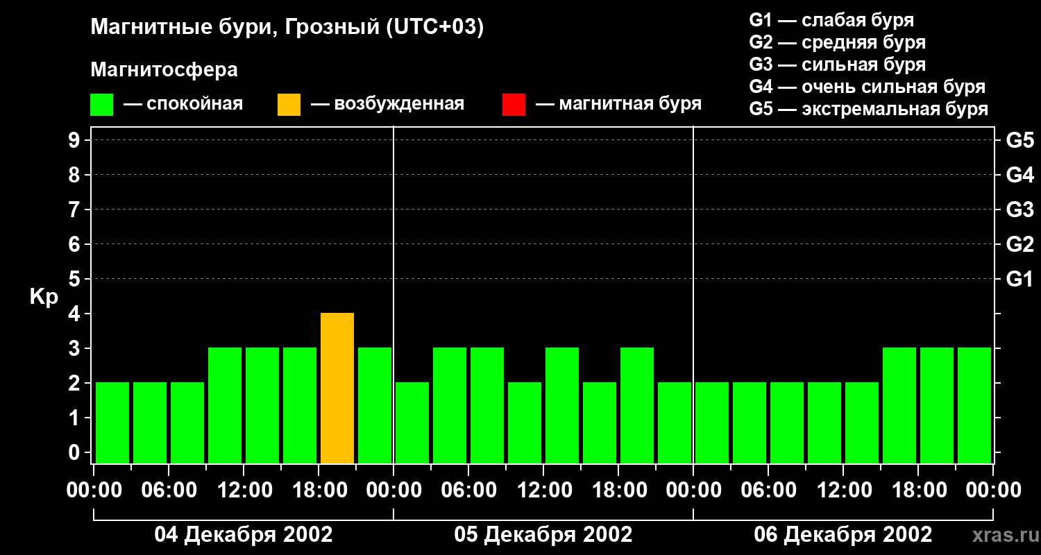 Изменения геомагнитного индекса Kp с 4 по 6 декабря 2002 года для средних широт