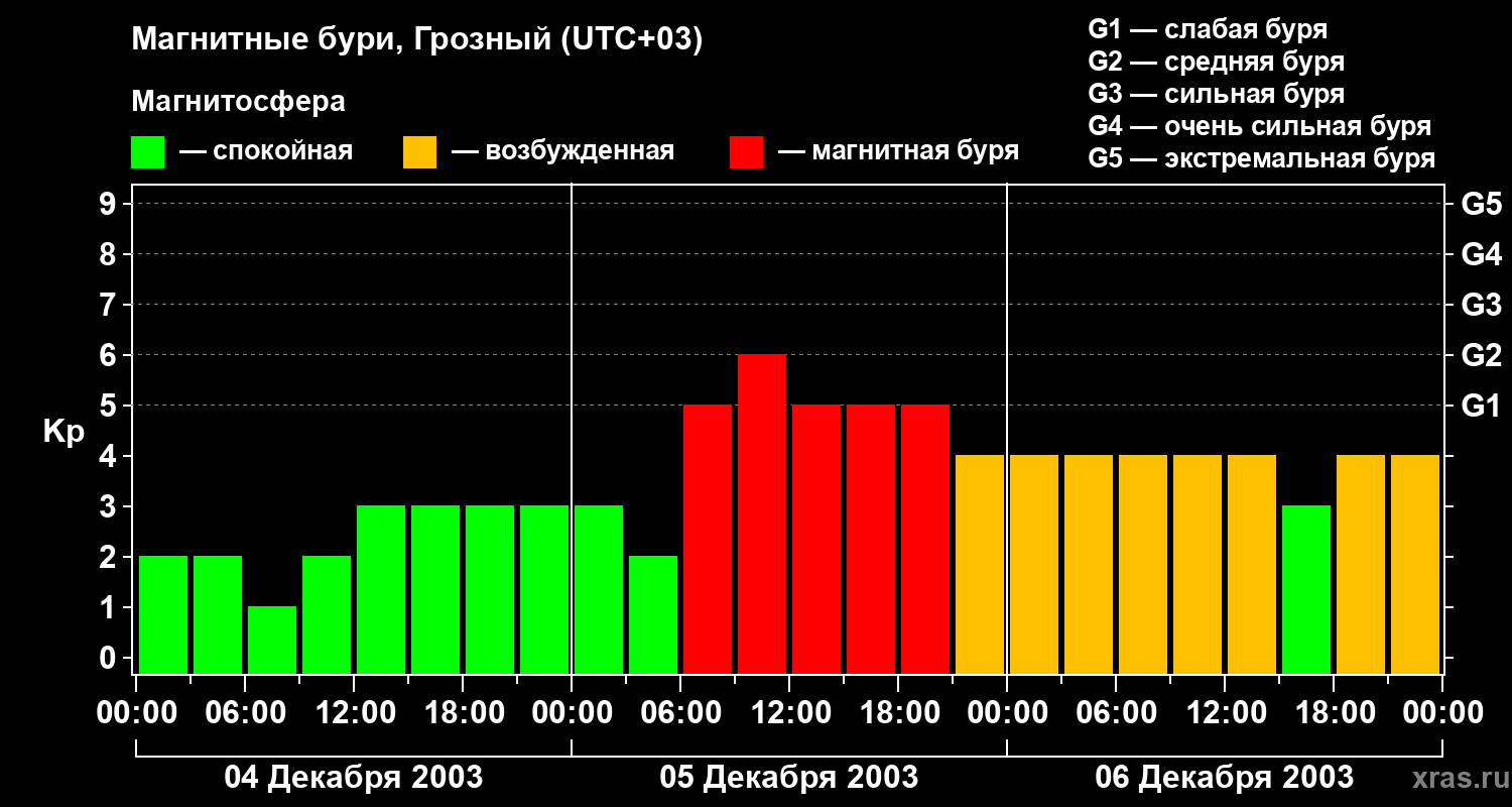 Изменения геомагнитного индекса Kp с 4 по 6 декабря 2003 года для средних широт