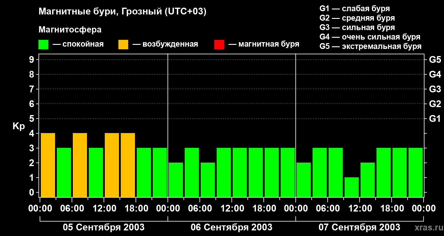Изменения геомагнитного индекса Kp с 5 по 7 сентября 2003 года для средних широт