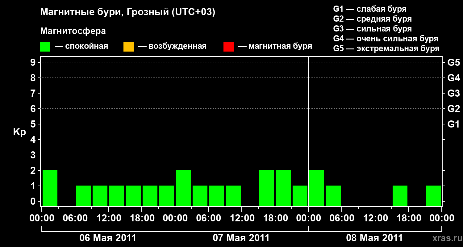 Изменения геомагнитного индекса Kp с 6 по 8 мая 2011 года для средних широт