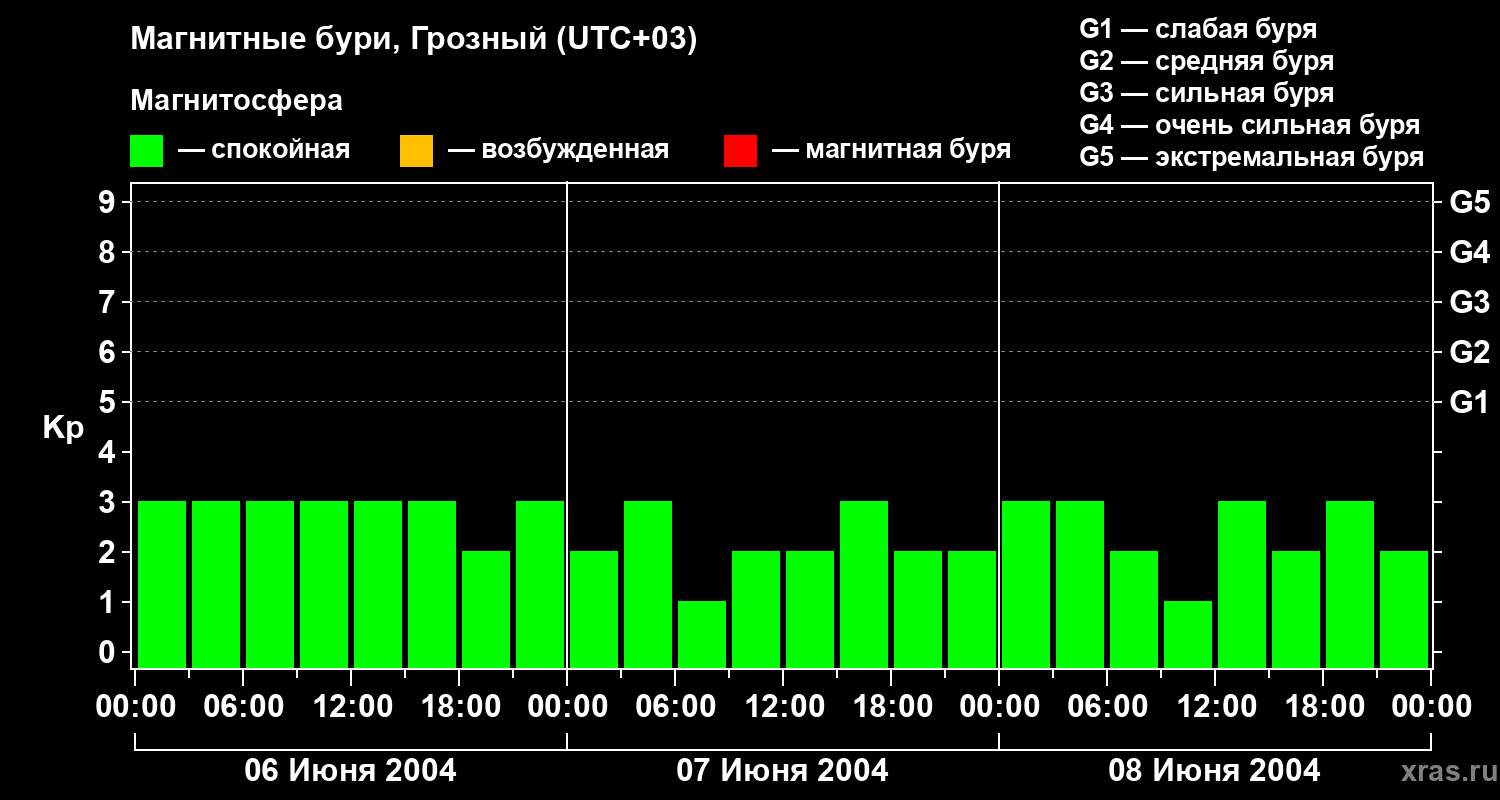 Изменения геомагнитного индекса Kp с 6 по 8 июня 2004 года для средних широт
