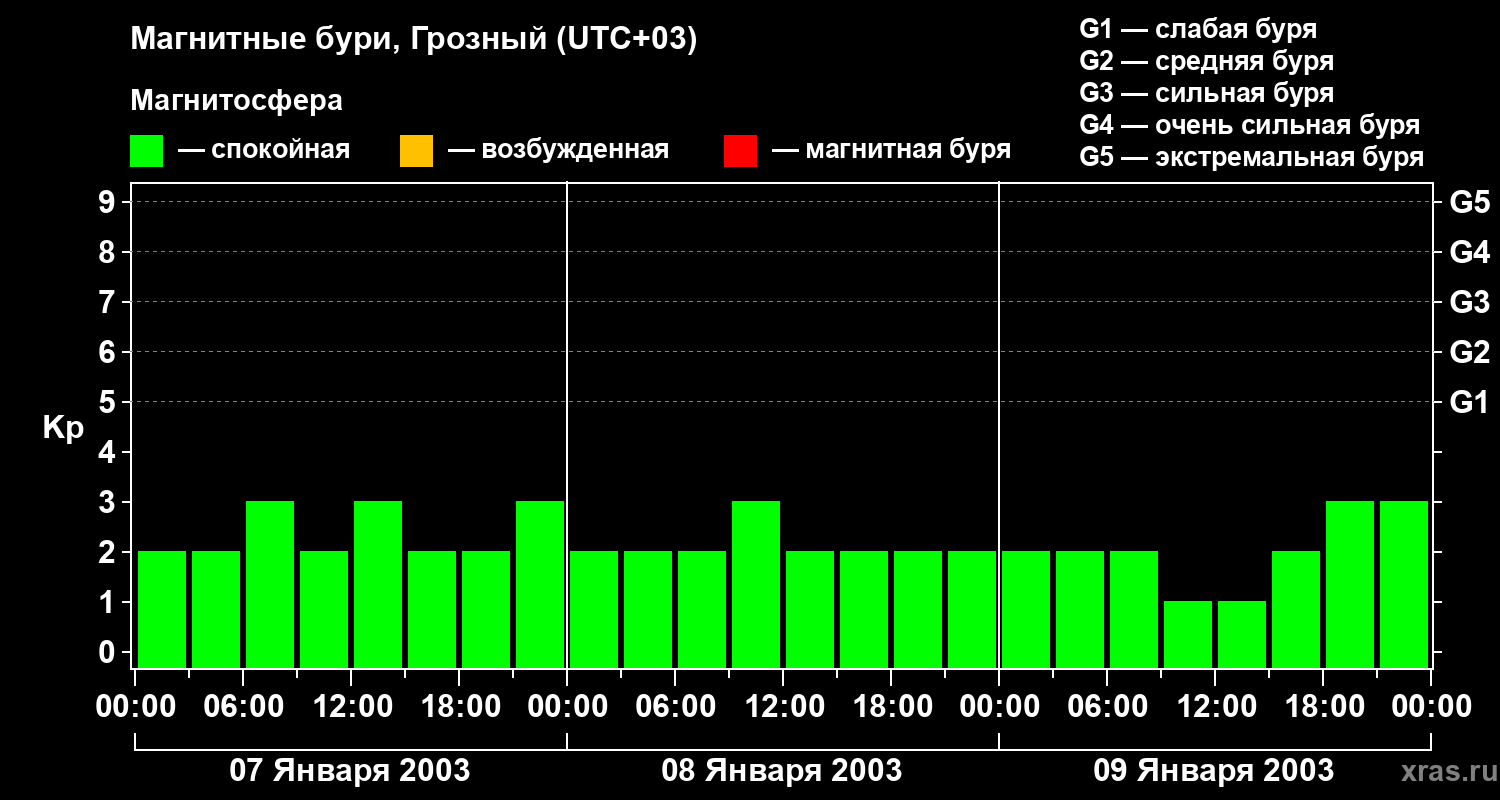 Изменения геомагнитного индекса Kp с 7 по 9 января 2003 года для средних широт