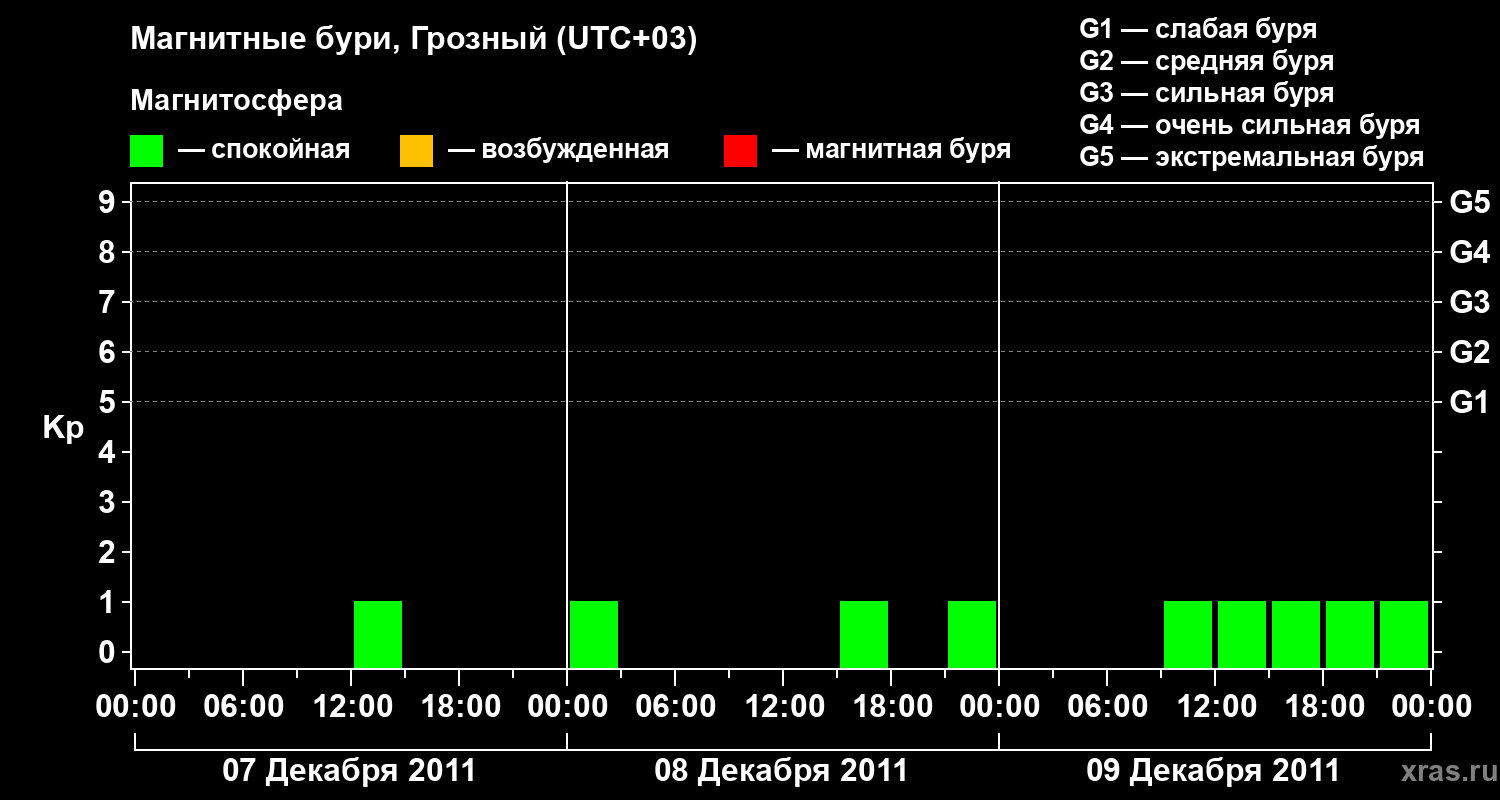 Изменения геомагнитного индекса Kp с 7 по 9 декабря 2011 года для средних широт