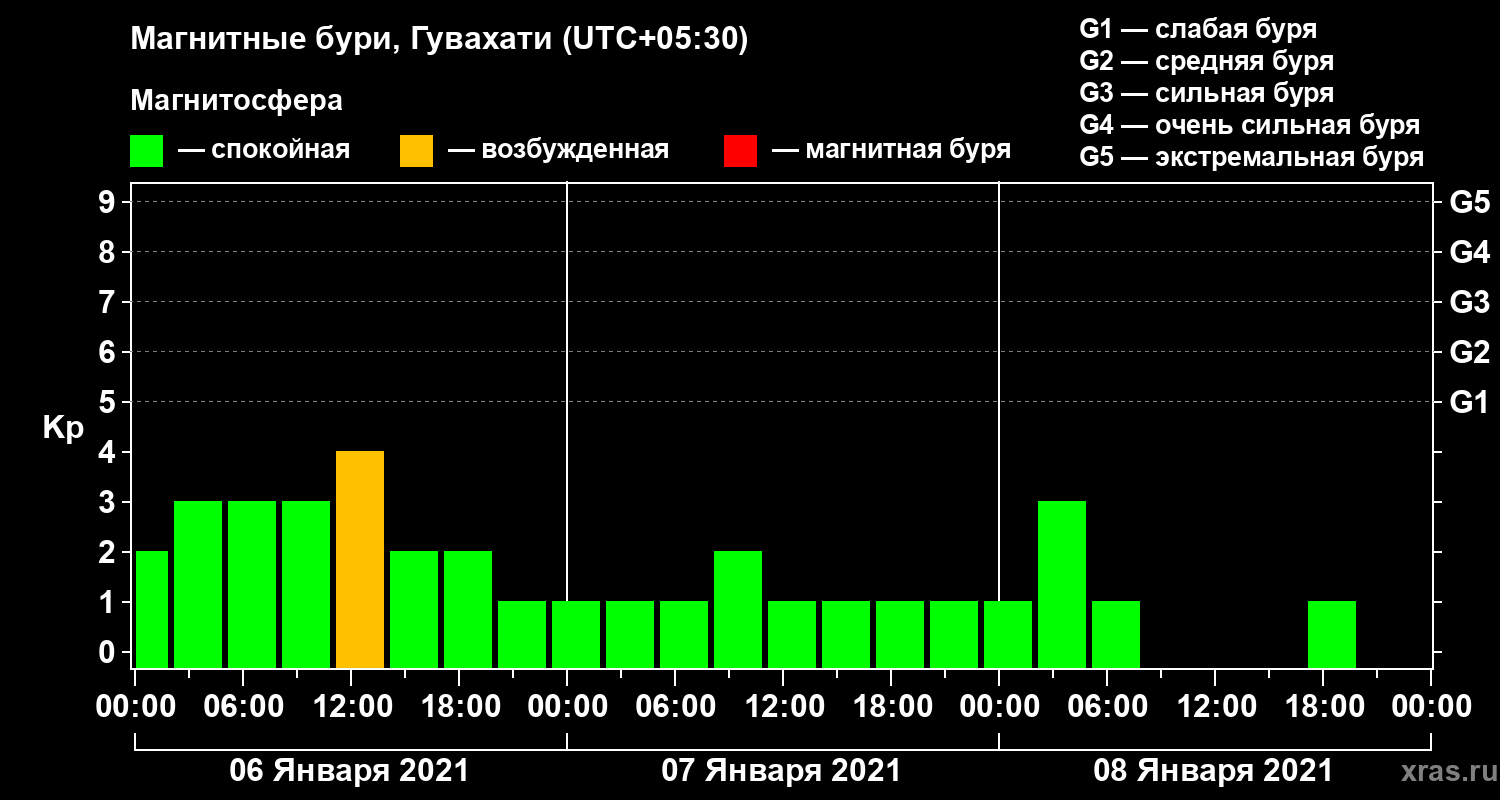 Изменения геомагнитного индекса Kp с 6 по 8 января 2021 года для средних широт