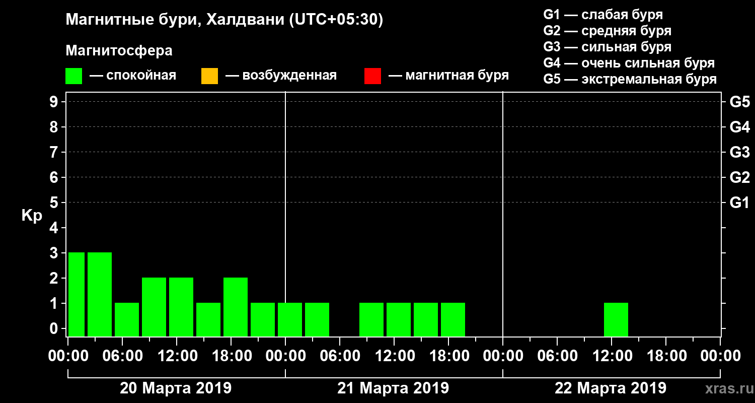 Изменения геомагнитного индекса Kp с 20 по 22 марта 2019 года для средних широт