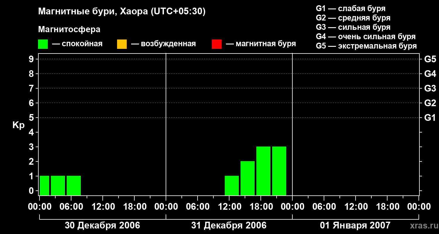 Изменения геомагнитного индекса Kp с 30 декабря 2006 года по 1 января 2007 года для средних широт