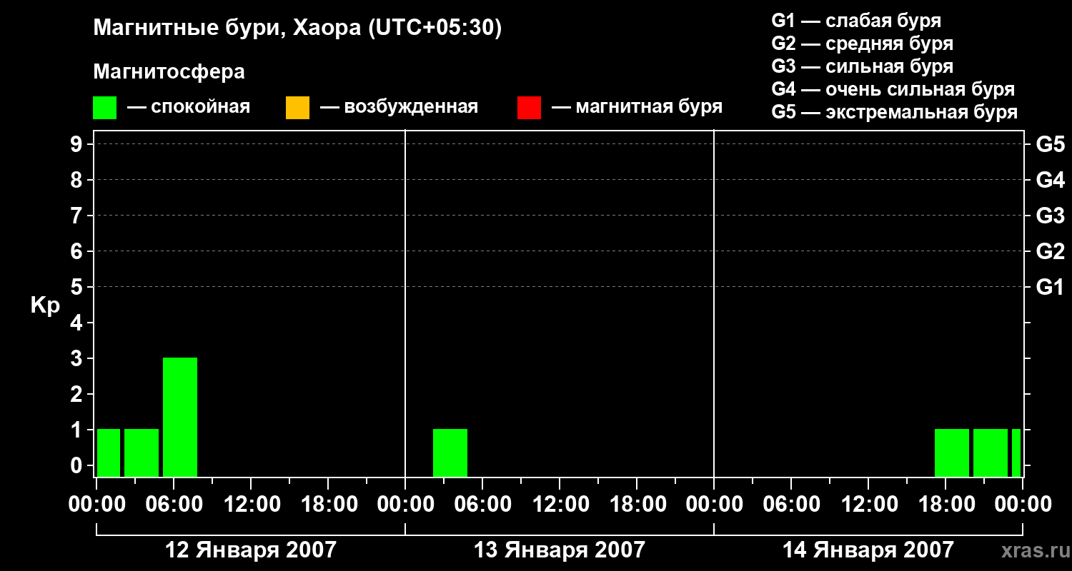 Изменения геомагнитного индекса Kp с 12 по 14 января 2007 года для средних широт
