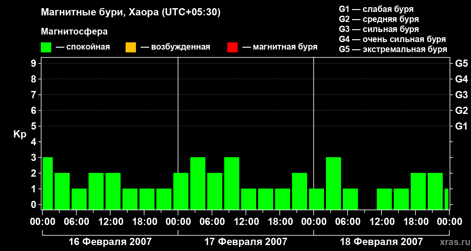 Изменения геомагнитного индекса Kp с 16 по 18 февраля 2007 года для средних широт