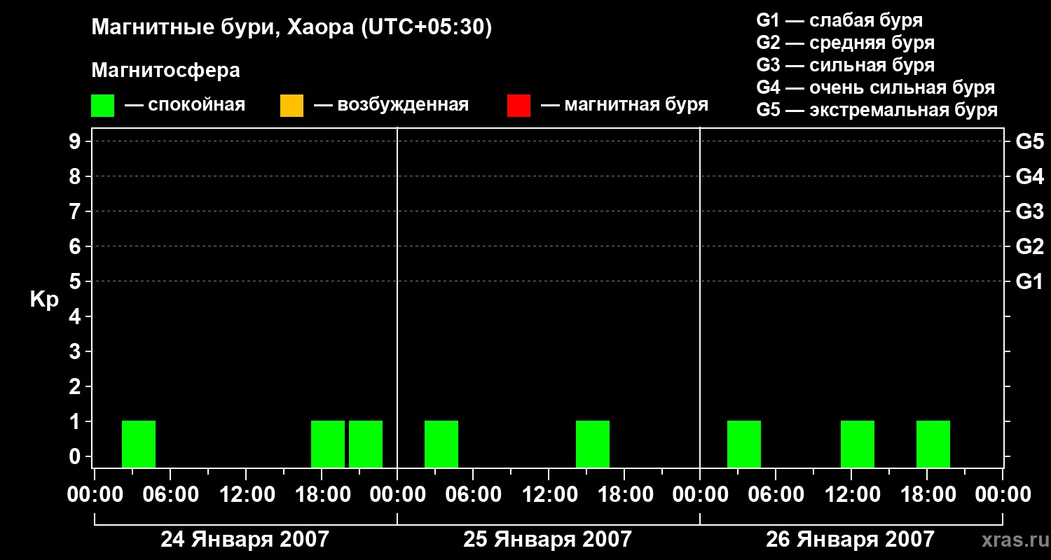 Изменения геомагнитного индекса Kp с 24 по 26 января 2007 года для средних широт
