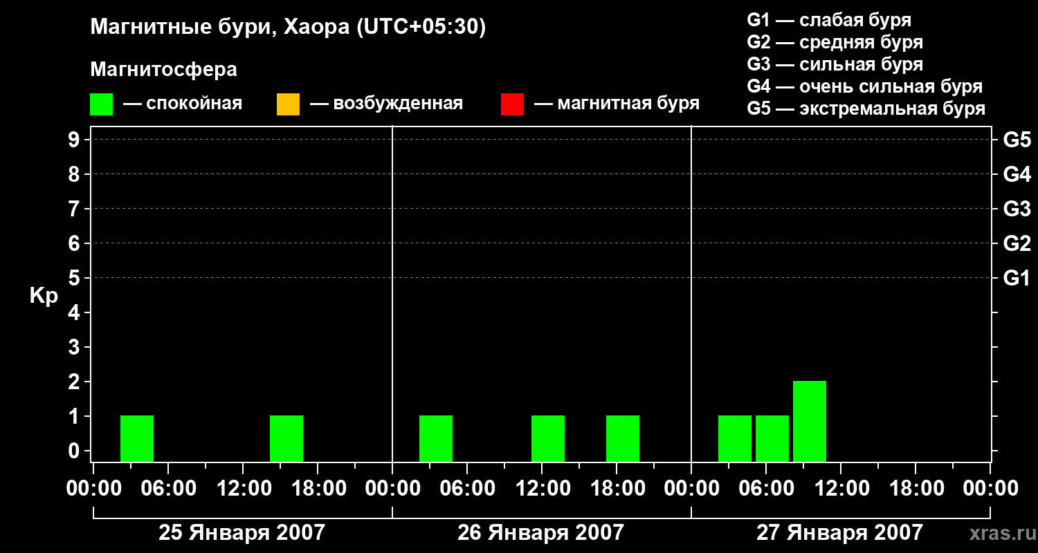 Изменения геомагнитного индекса Kp с 25 по 27 января 2007 года для средних широт