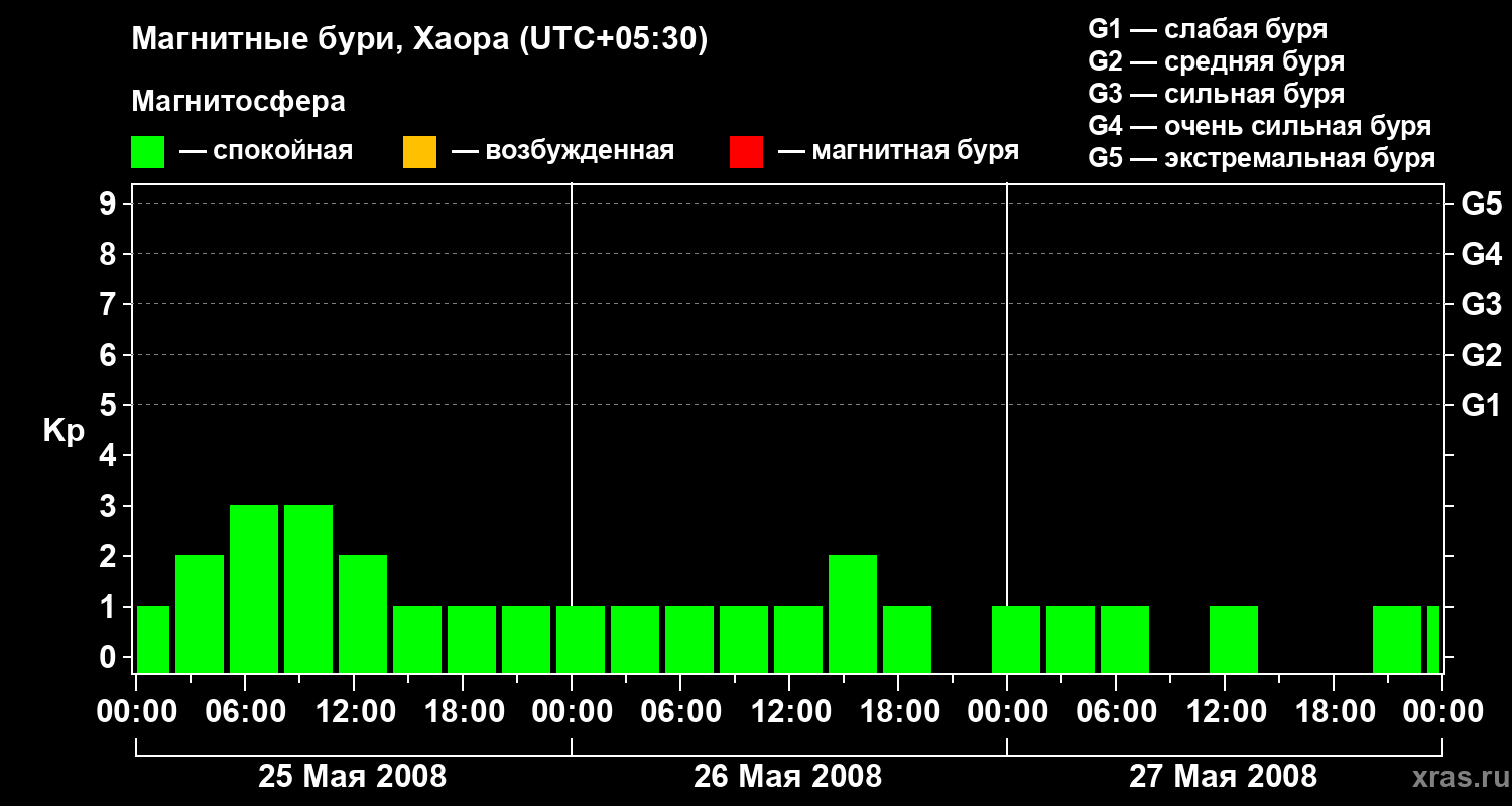 Изменения геомагнитного индекса Kp с 25 по 27 мая 2008 года для средних широт