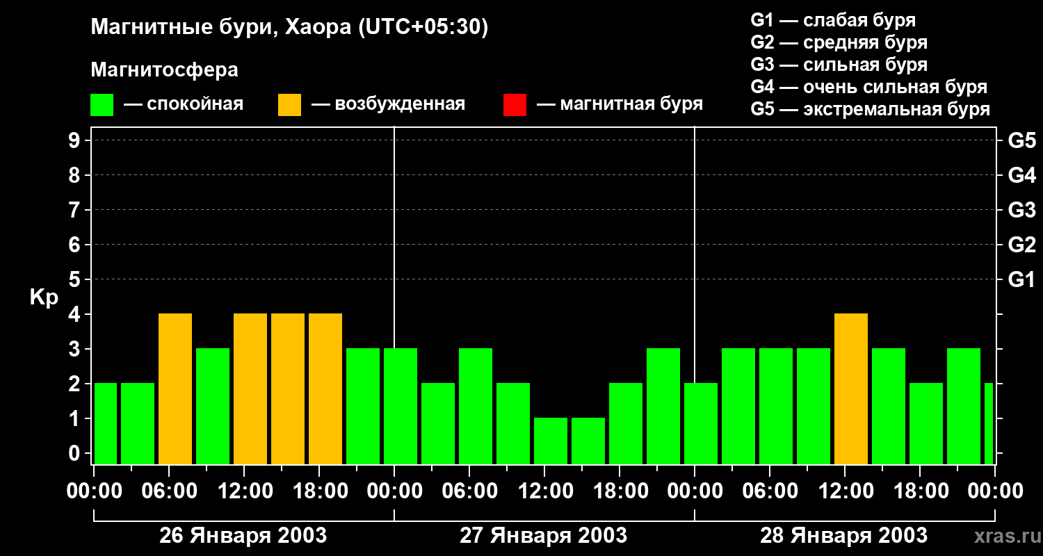 Изменения геомагнитного индекса Kp с 26 по 28 января 2003 года для средних широт