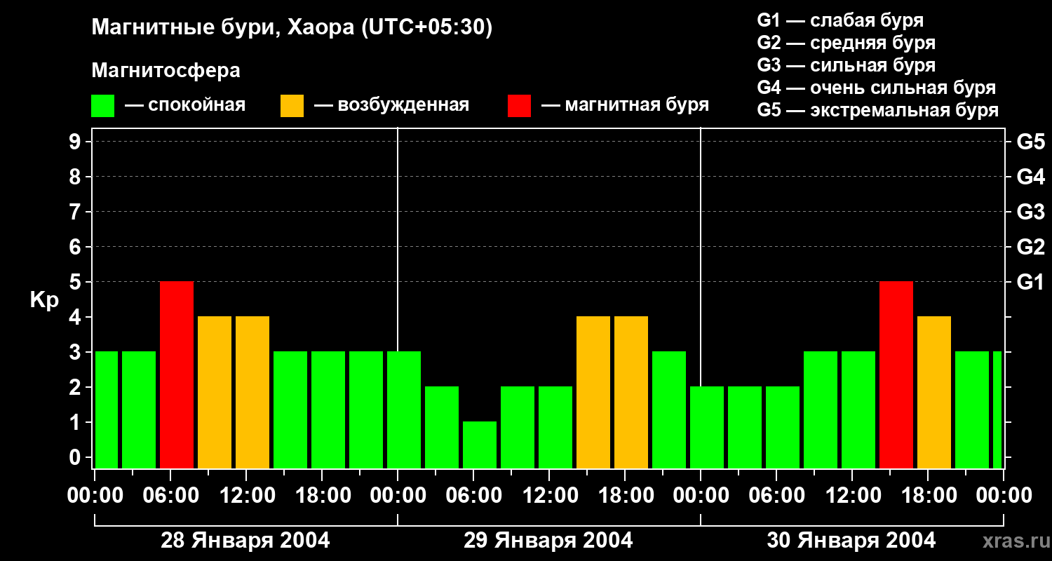 Изменения геомагнитного индекса Kp с 28 по 30 января 2004 года для средних широт