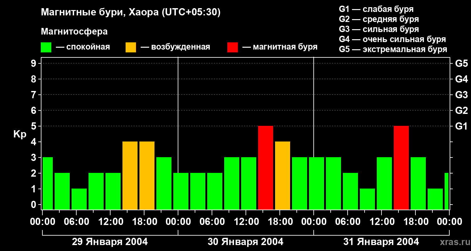 Изменения геомагнитного индекса Kp с 29 по 31 января 2004 года для средних широт