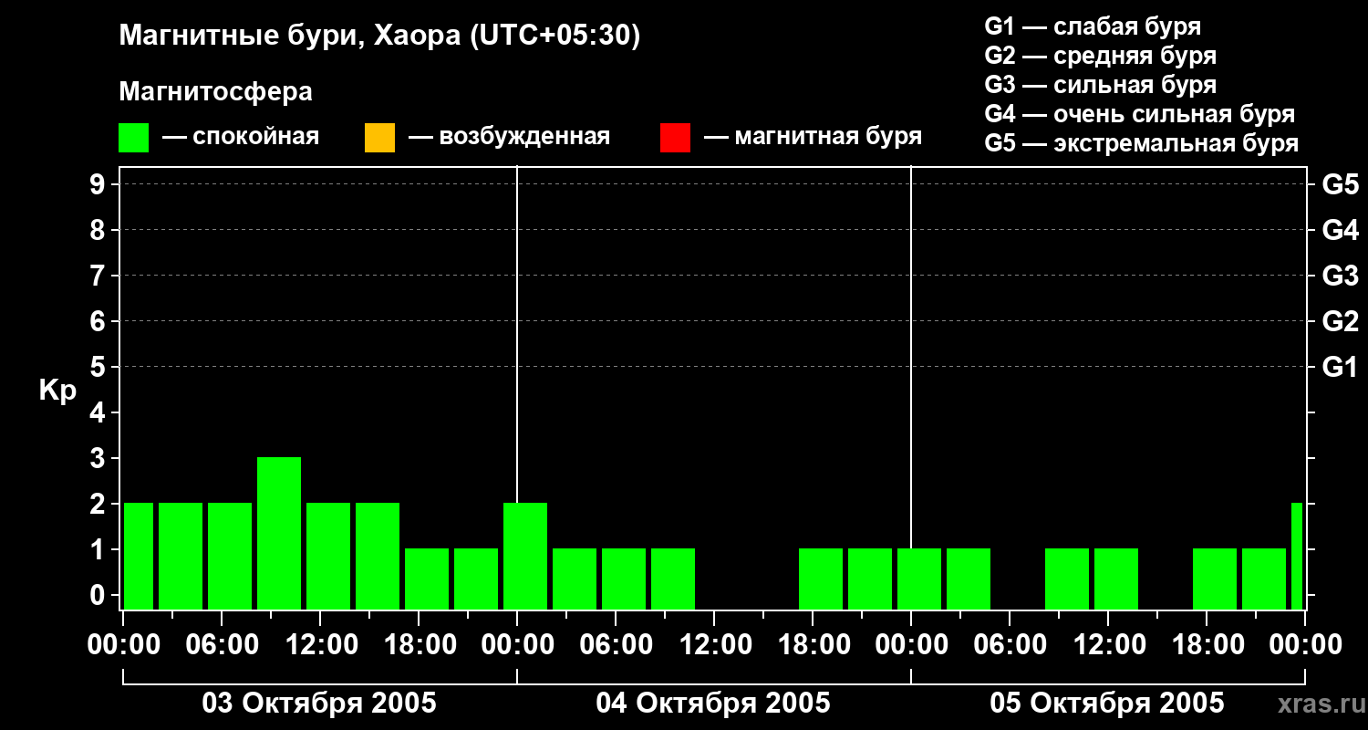 Изменения геомагнитного индекса Kp с 3 по 5 октября 2005 года для средних широт