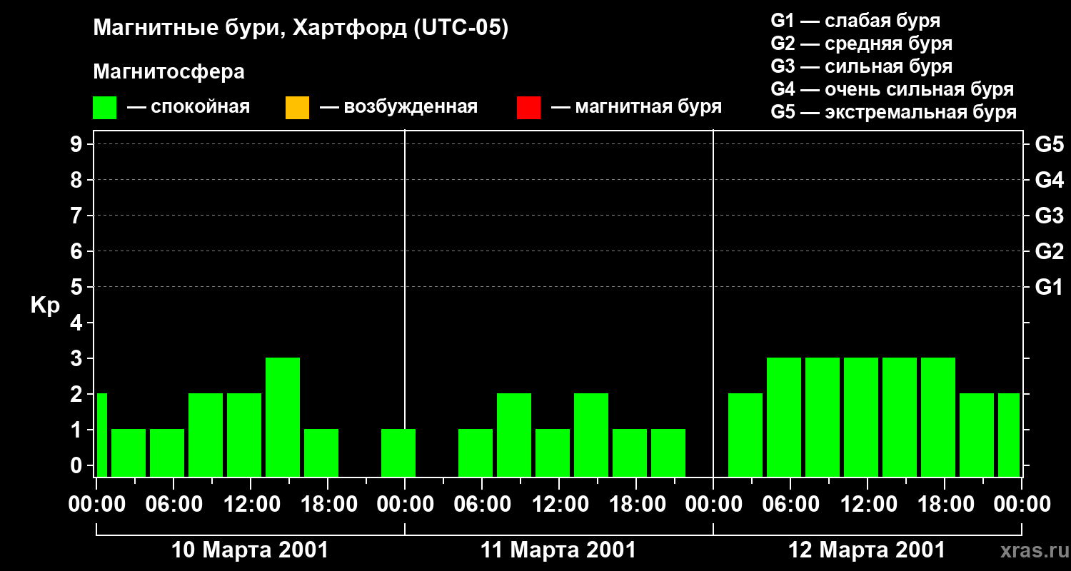 Изменения геомагнитного индекса Kp с 10 по 12 марта 2001 года для средних широт