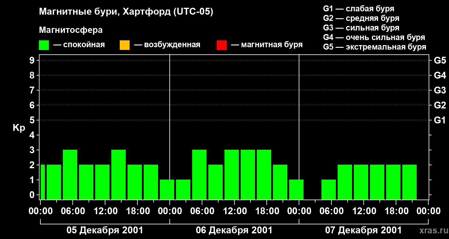 Изменения геомагнитного индекса Kp с 5 по 7 декабря 2001 года для средних широт