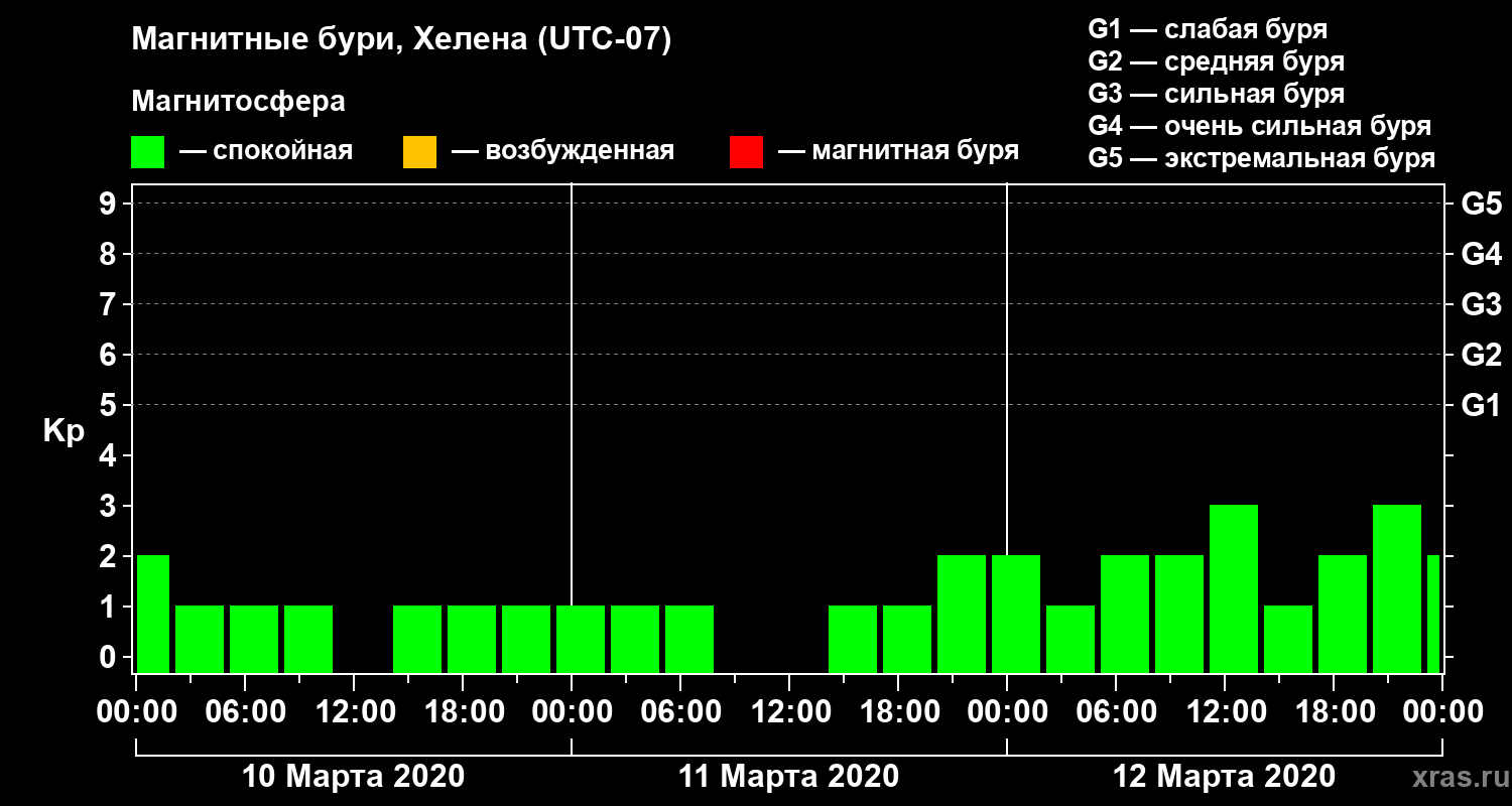 Изменения геомагнитного индекса Kp с 10 по 12 марта 2020 года для средних широт