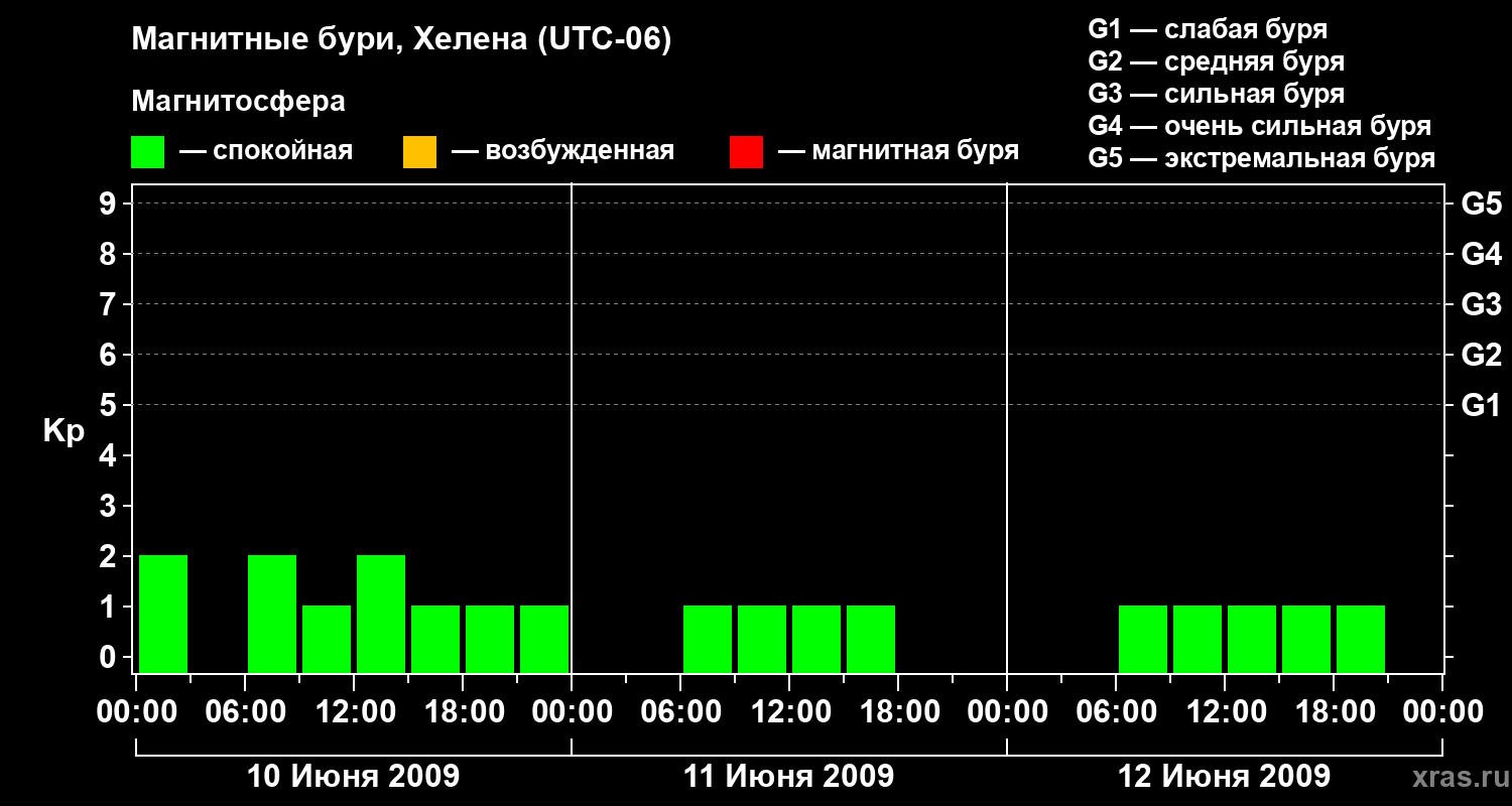Изменения геомагнитного индекса Kp с 10 по 12 июня 2009 года для средних широт