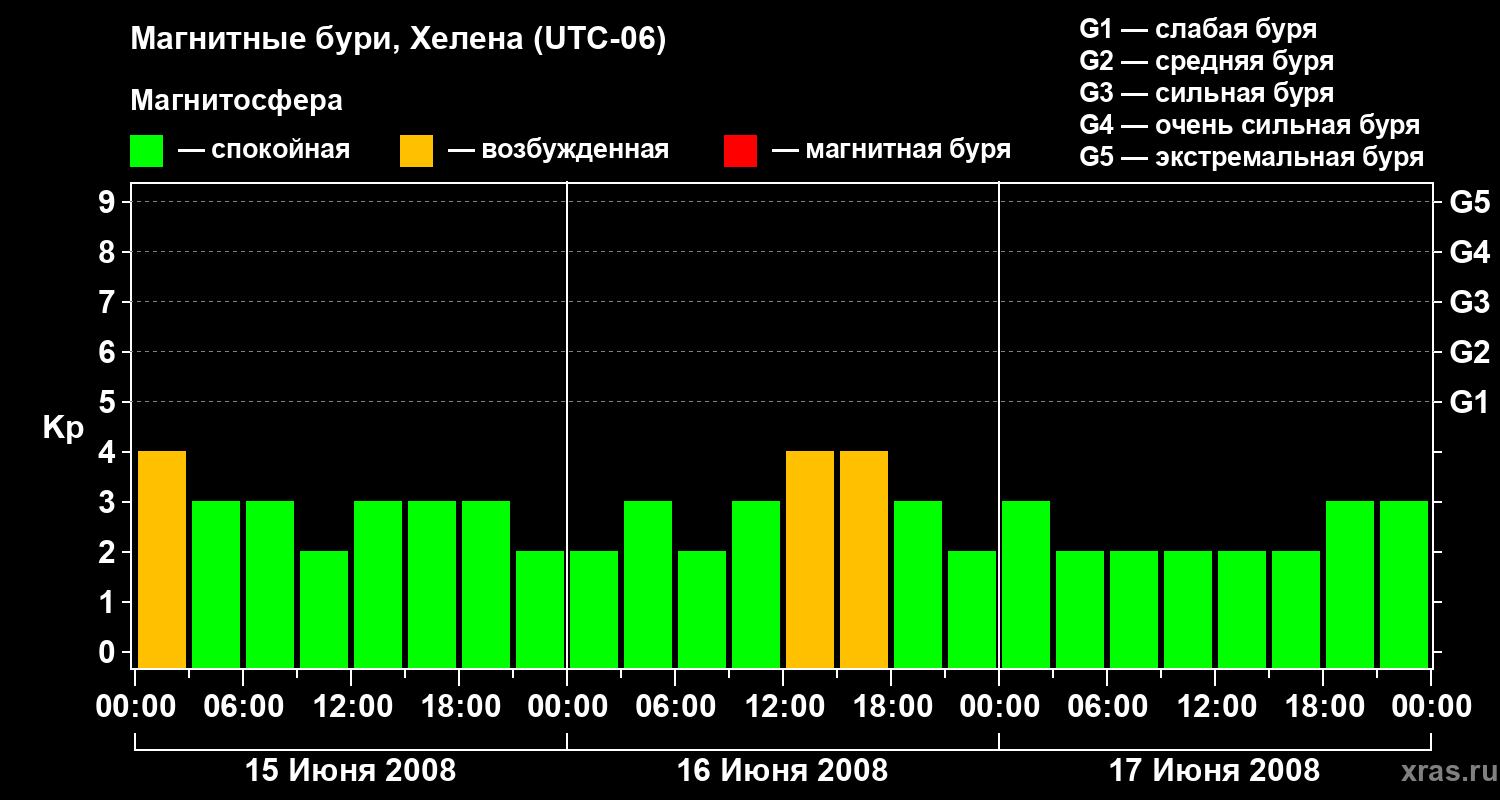 Изменения геомагнитного индекса Kp с 15 по 17 июня 2008 года для средних широт