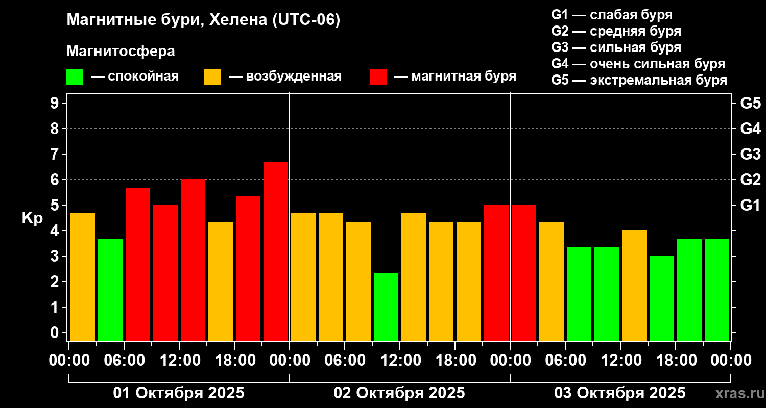 Изменения геомагнитного индекса Kp с 1 по 3 октября 2025 года для средних широт