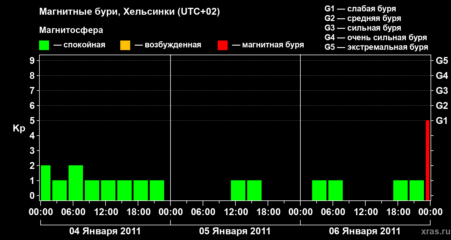 Изменения геомагнитного индекса Kp с 4 по 6 января 2011 года для средних широт