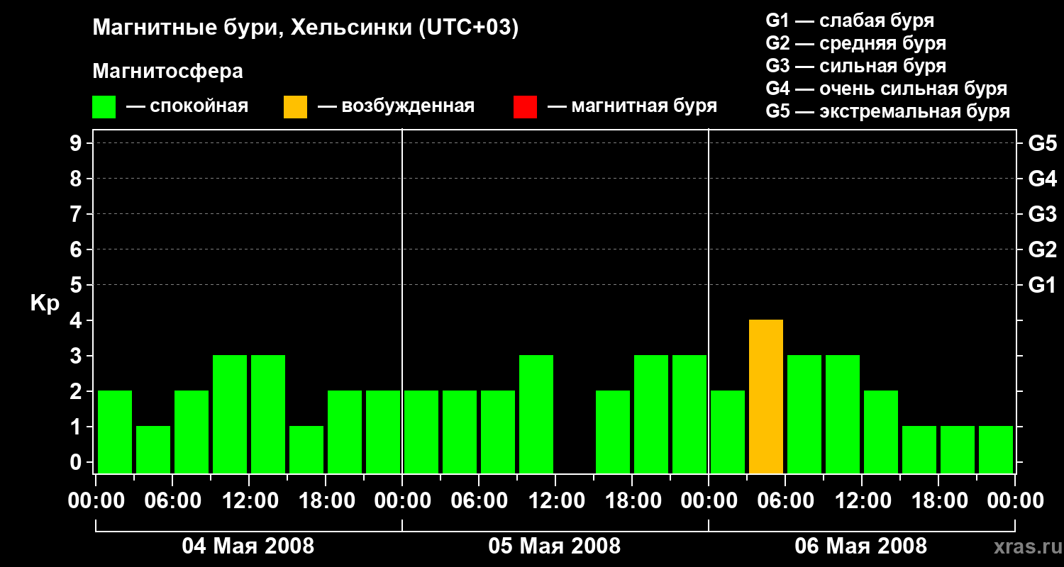 Изменения геомагнитного индекса Kp с 4 по 6 мая 2008 года для средних широт