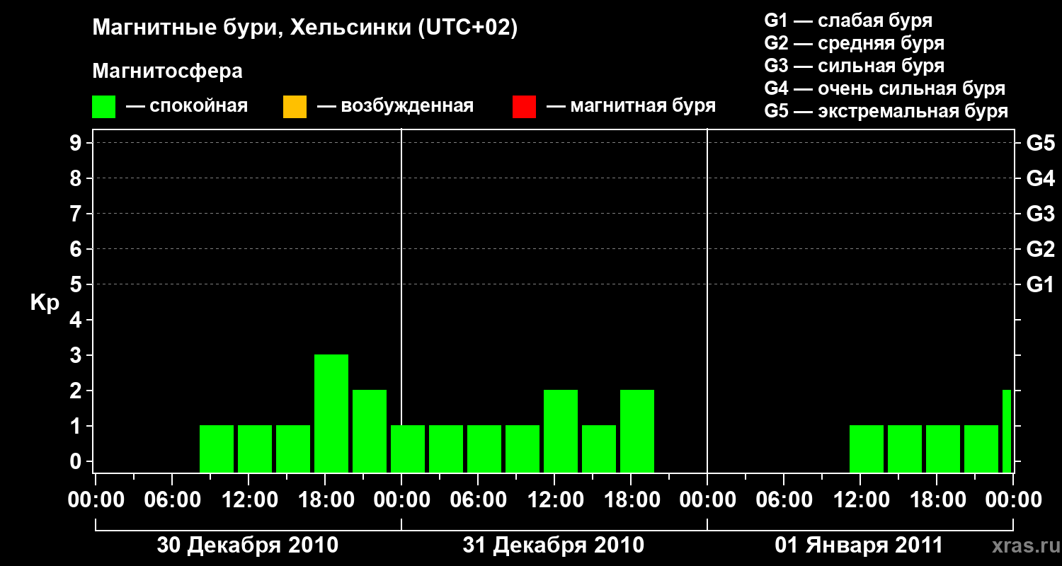 Изменения геомагнитного индекса Kp с 30 декабря 2010 года по 1 января 2011 года для средних широт