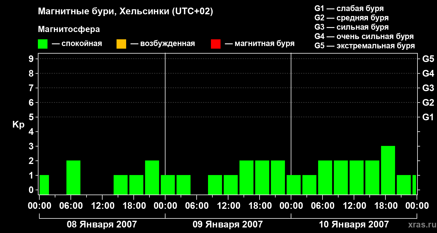 Изменения геомагнитного индекса Kp с 8 по 10 января 2007 года для средних широт