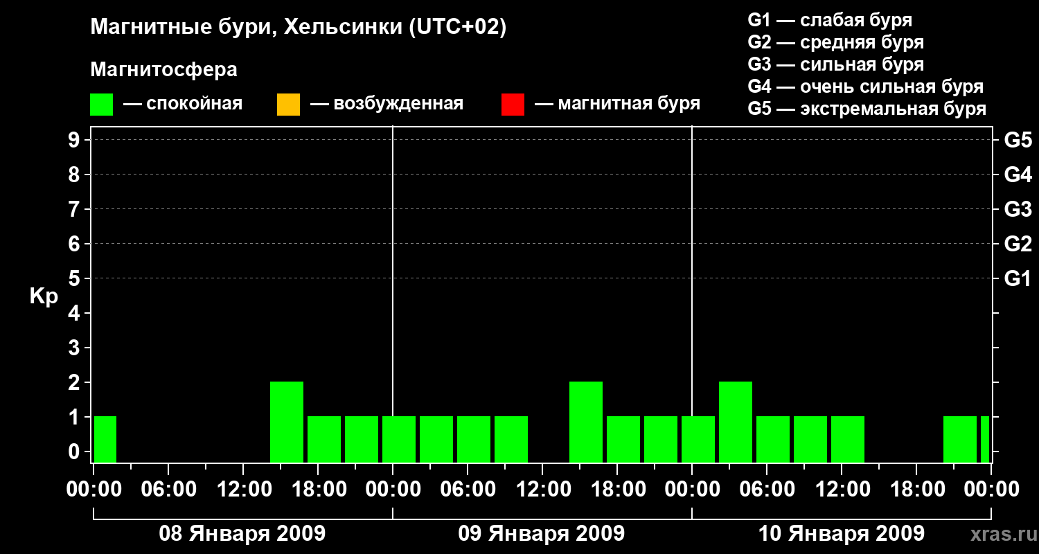 Изменения геомагнитного индекса Kp с 8 по 10 января 2009 года для средних широт
